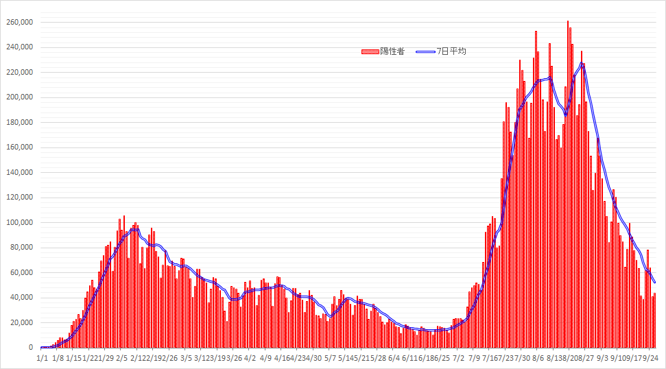 | 折れ線グラフは「当日発生の陽性者数の直近7日間の平均」 | |