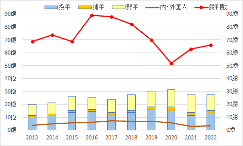 チーム別 年俸と勝利数の推移(2013〜2022)