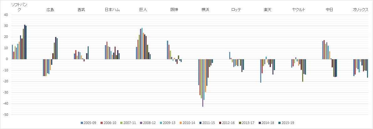 下のグラフは各球団の勝敗数の差の5年間の平均を集計したものです。