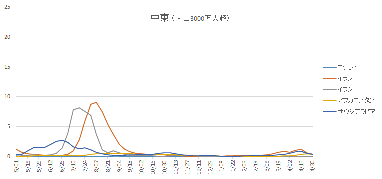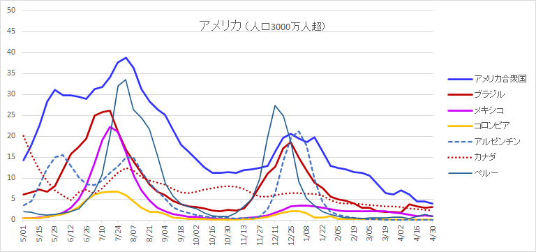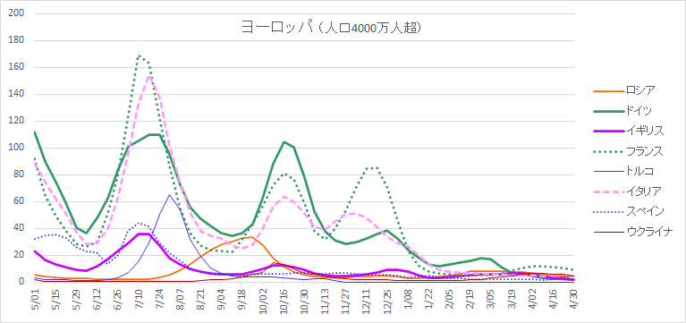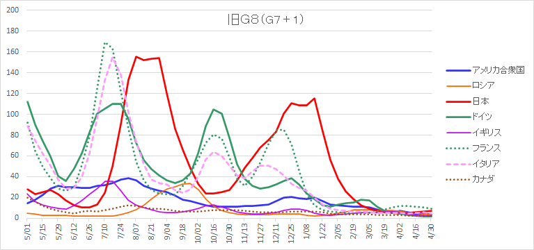 7日毎に、直近 14日間の10万人あたりの感染者数増加数の平均値をグラフ化
